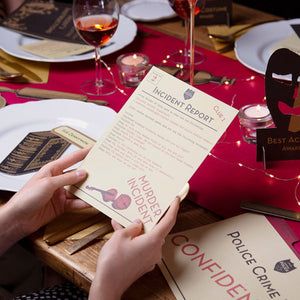 Inside the box, your customers will find a whole array of themed props, clues and weapons to set the scene in their own home. The host reads out the welcome speech to introduce the characters and unfold the story. There is a specific character for the host to play (Alex Cited - the host is not a suspect but still a participant) and the victim is not a guest - pages 3 & 4 of the instruction booklet give more detail. Players must work together to solve the clues and identify the murderer before they strike again!