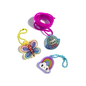 Simply colour with pencils or markers, bake with adult supervision, and attach to the included chains or cords. Easy, fun, and totally satisfying.