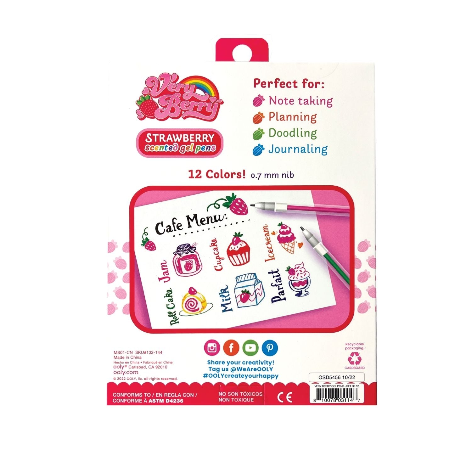 12 different colored gel pens are included in the set, but each one shares that unforgettable strawberry scent!
