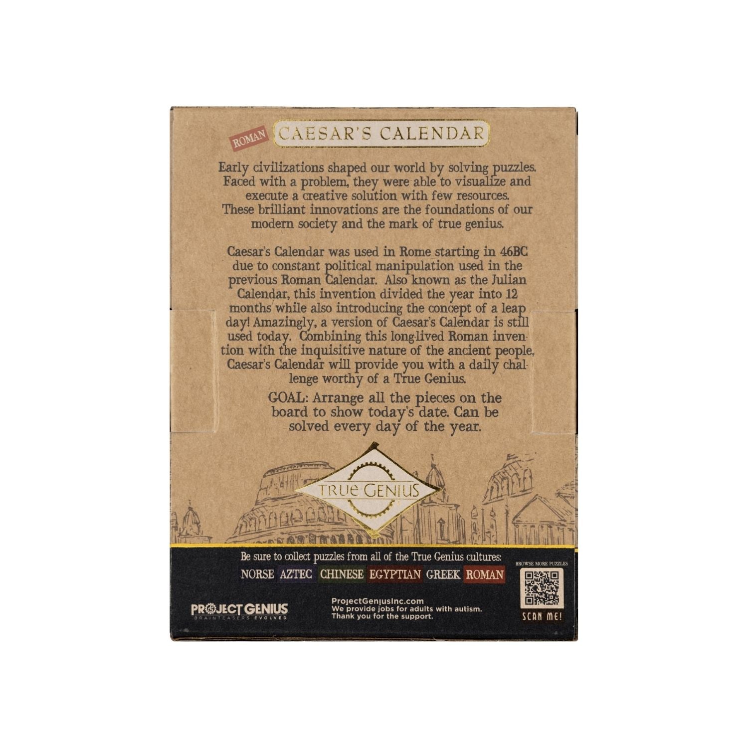 Step back in time to the innovation of Ancient Rome with Caesar’s Calendar, a puzzle inspired by the Julian Calendar, introduced by Julius Caesar in 46 BC.  The Julian Calendar divided the year into 12 months and introduced the leap day - concepts still used in modern calendars.