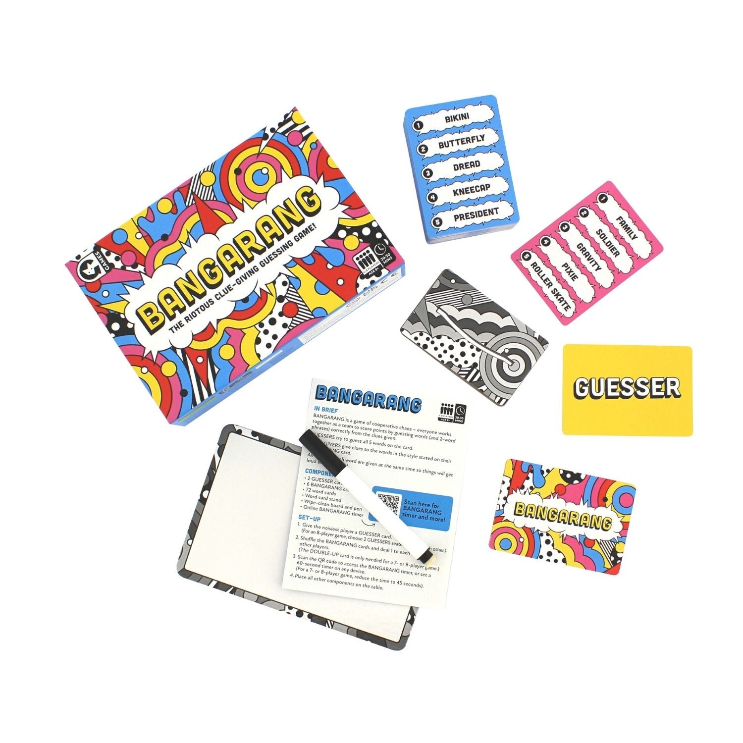 Get ready for a wild ride of laughter, creativity, and teamwork with BANGARANG, the fun family game that takes clue-giving to a whole new level! In this high-energy game, players join forces to help the guesser unravel the mystery word on the card using a variety of entertaining clues.