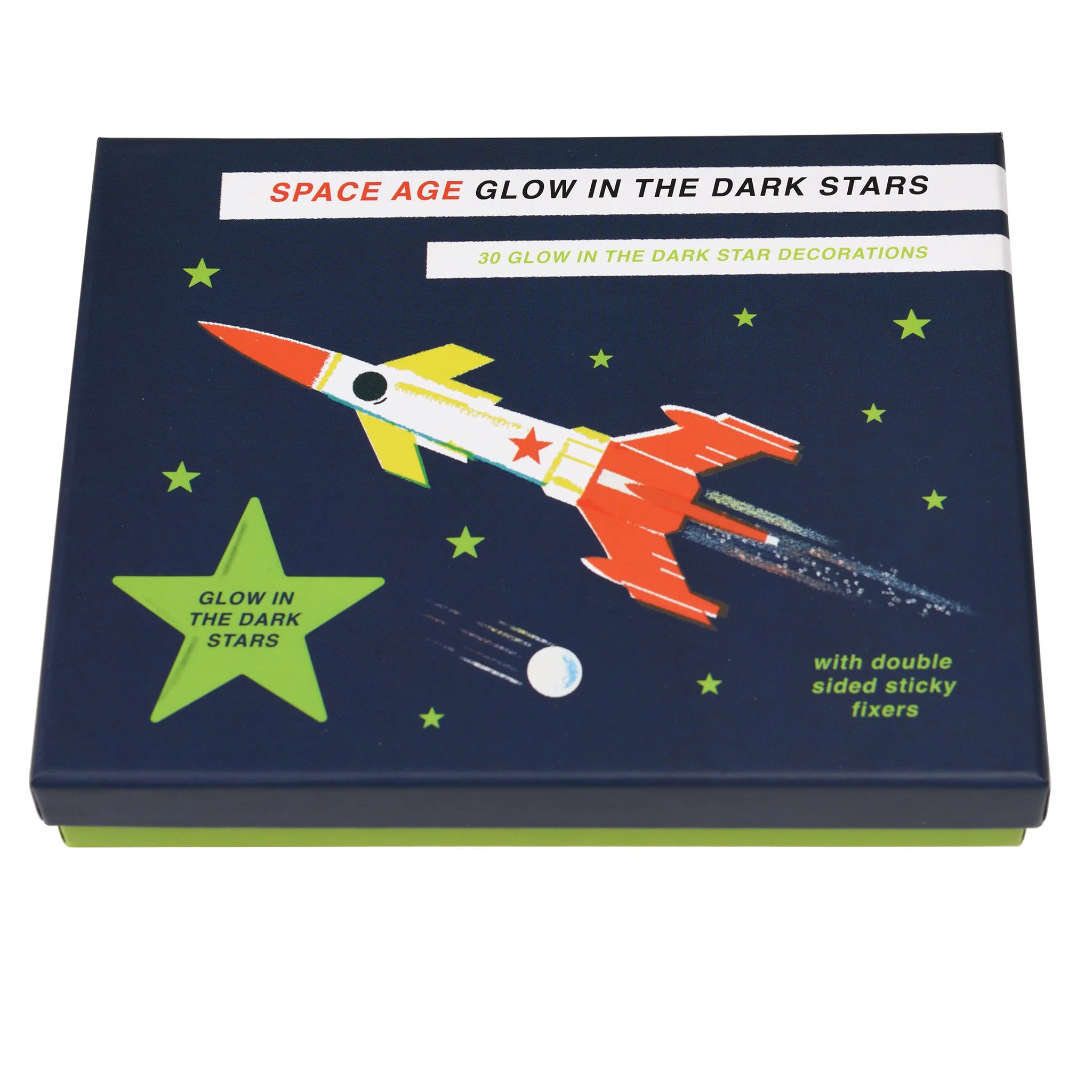 Glow-in-the-dark stars make a great decoration for walls and ceilings in children's bedrooms. This Space Age box contains 30 stars in assorted sizes, including sticky fixers.