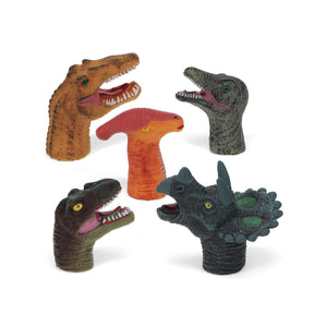 Set of five dinosaur head finger puppets, with authentic colours and details to give them a realistic look.