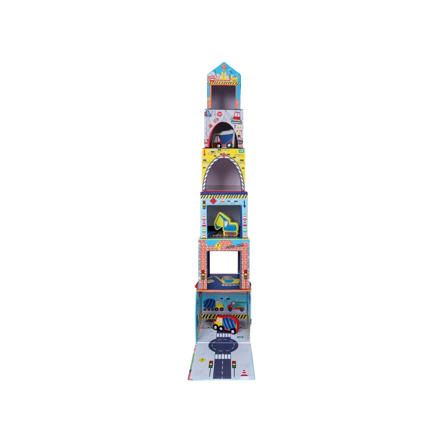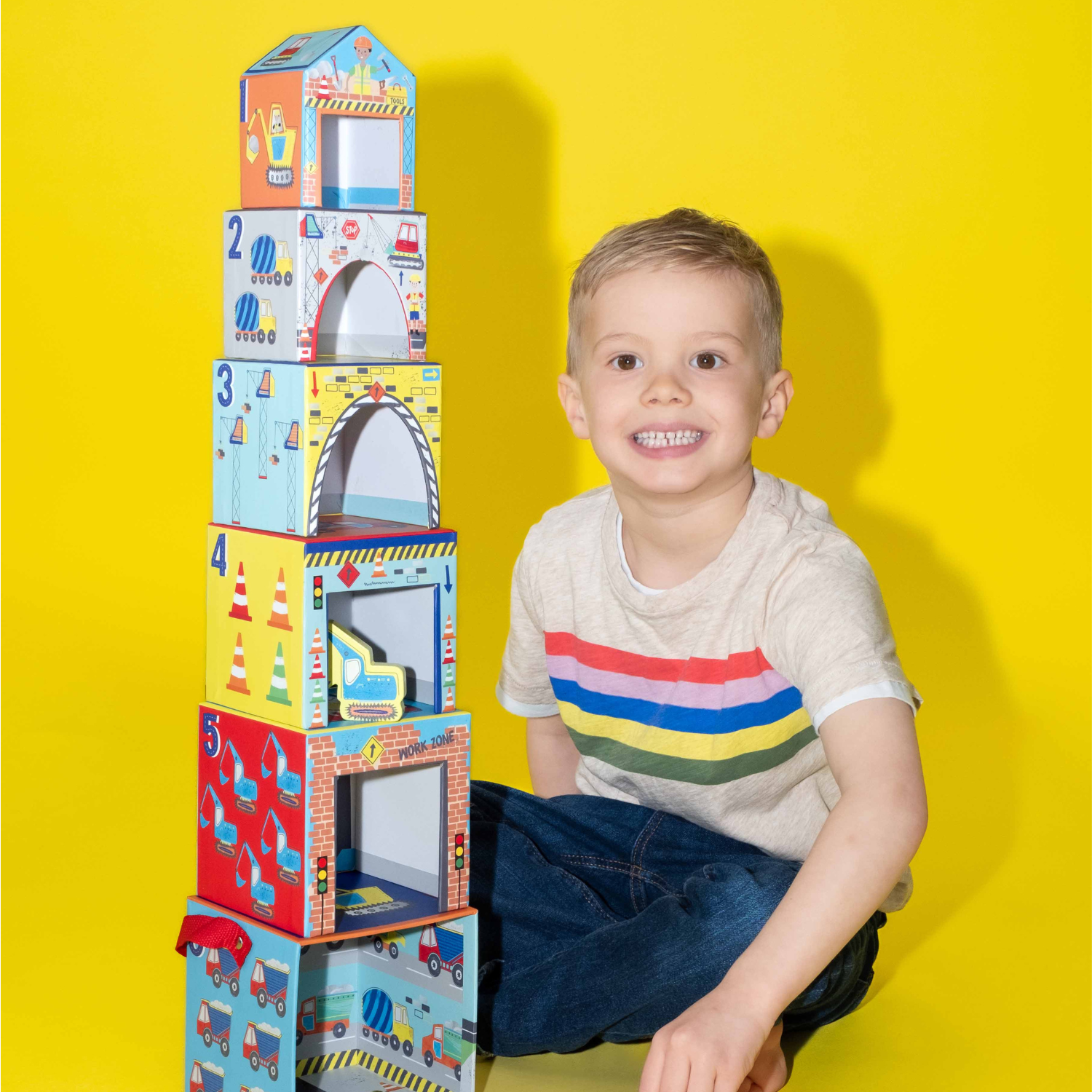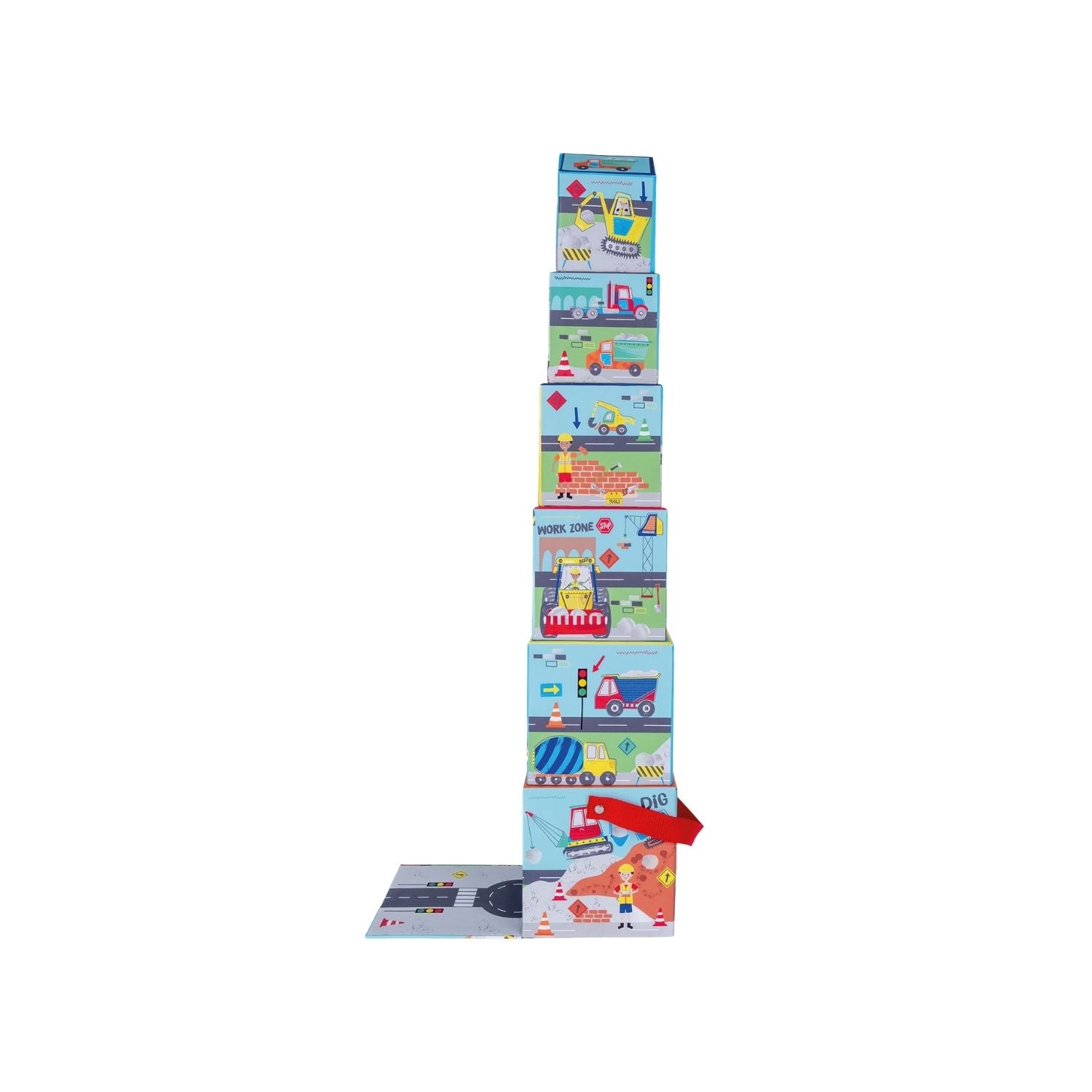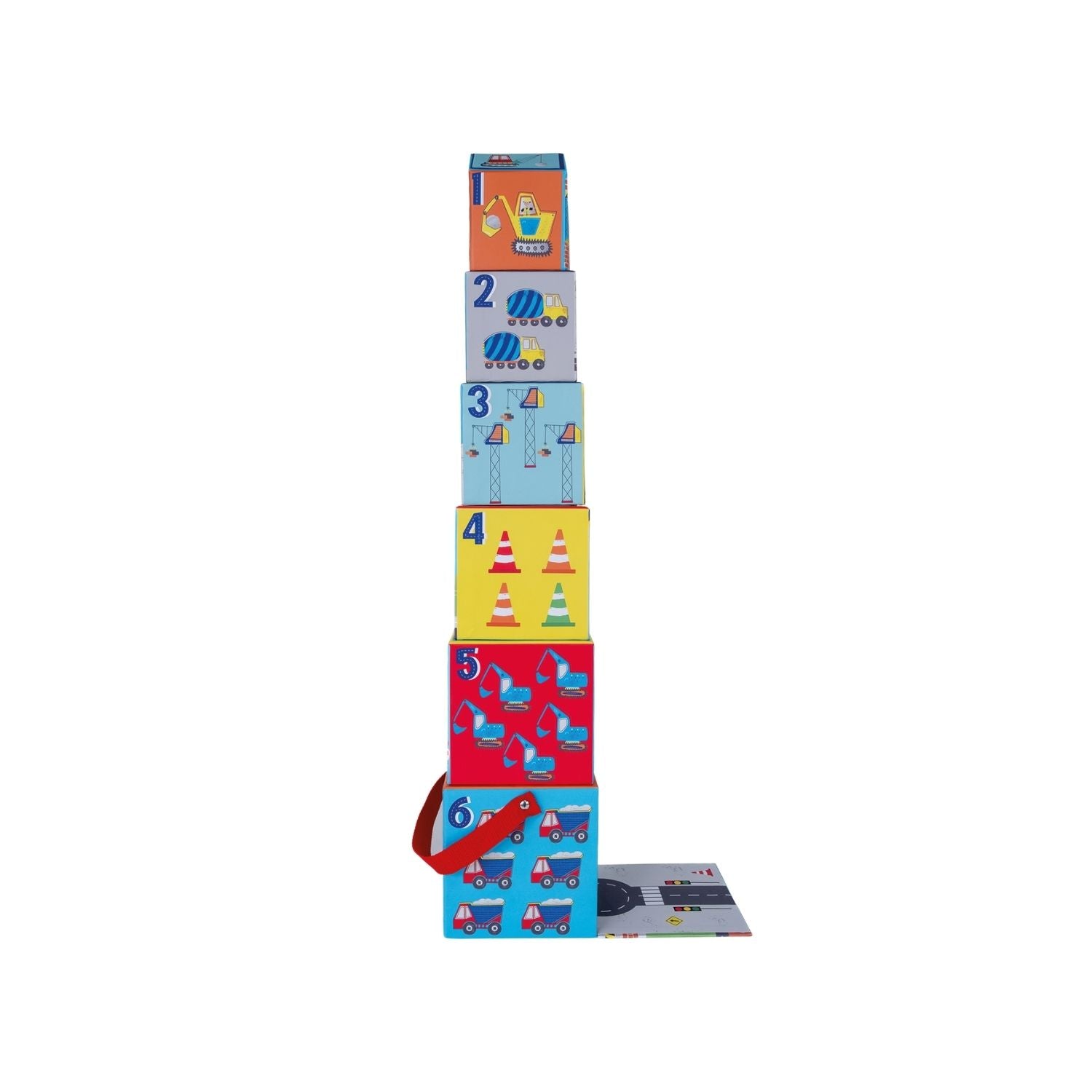 The cool Construction design features diggers, trucks, cement mixers and more. Stack & Play includes 6 stacking cubes, 3 wooden play pieces, 2 on wheels.